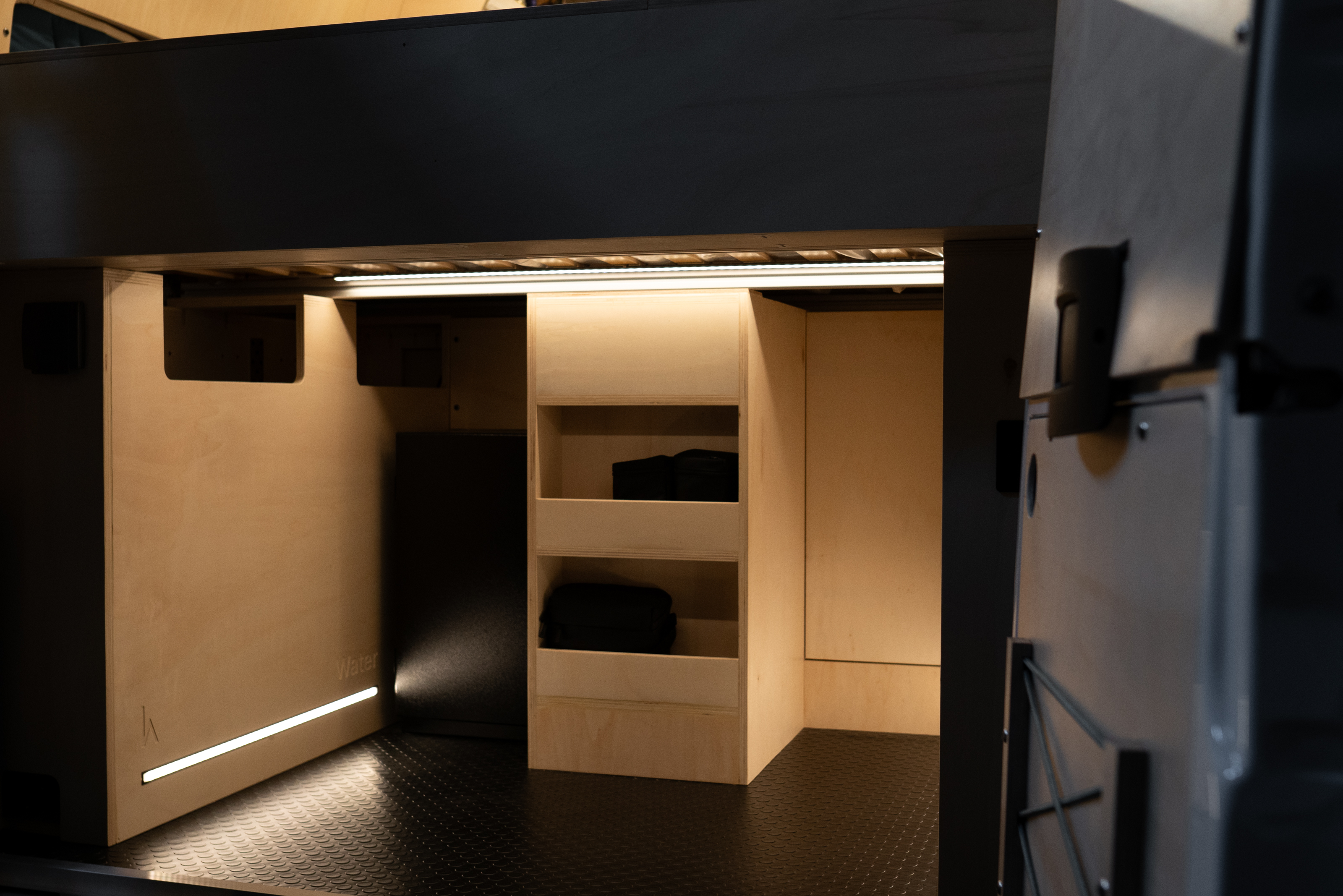 Hidden LED lit magazine rack behind the seat back keeps your favourite reads within easy reach, and an integrated shoe alcove by the door keeps shoes right to hand. In addition our neat little ply bungee frames are also ace for stuffing away jackets, magazines or if you’re like us, your eclectic range of beanie hats.